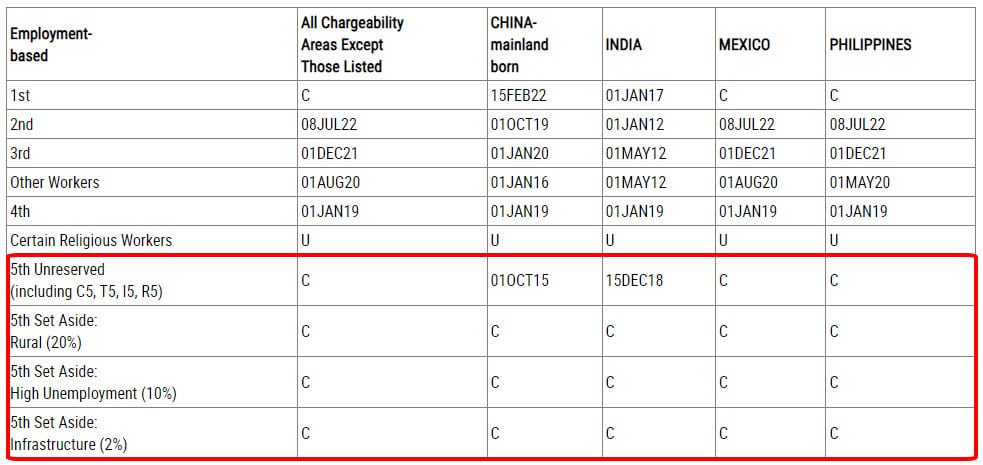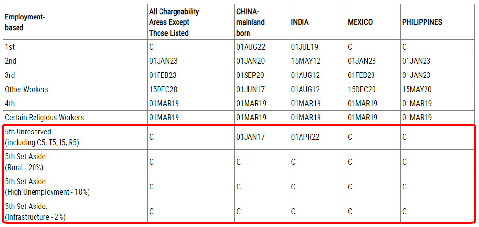 Cập nhật mới nhất từ Visa Bulletin cho thấy tiến độ xét duyệt hồ sơ định cư Mỹ EB-5 trong tháng 10/2023 của hai quốc gia bị tồn đọng hồ sơ là Trung Quốc đại lục và Ấn Độ đã có tiến triển mới. Các quốc gia khác (bao gồm Việt Nam) vẫn tiếp tục duy trì trạng thái “C” – có sẵn số Visa EB-5 để cấp cho các nhà đầu tư đủ điều kiện.