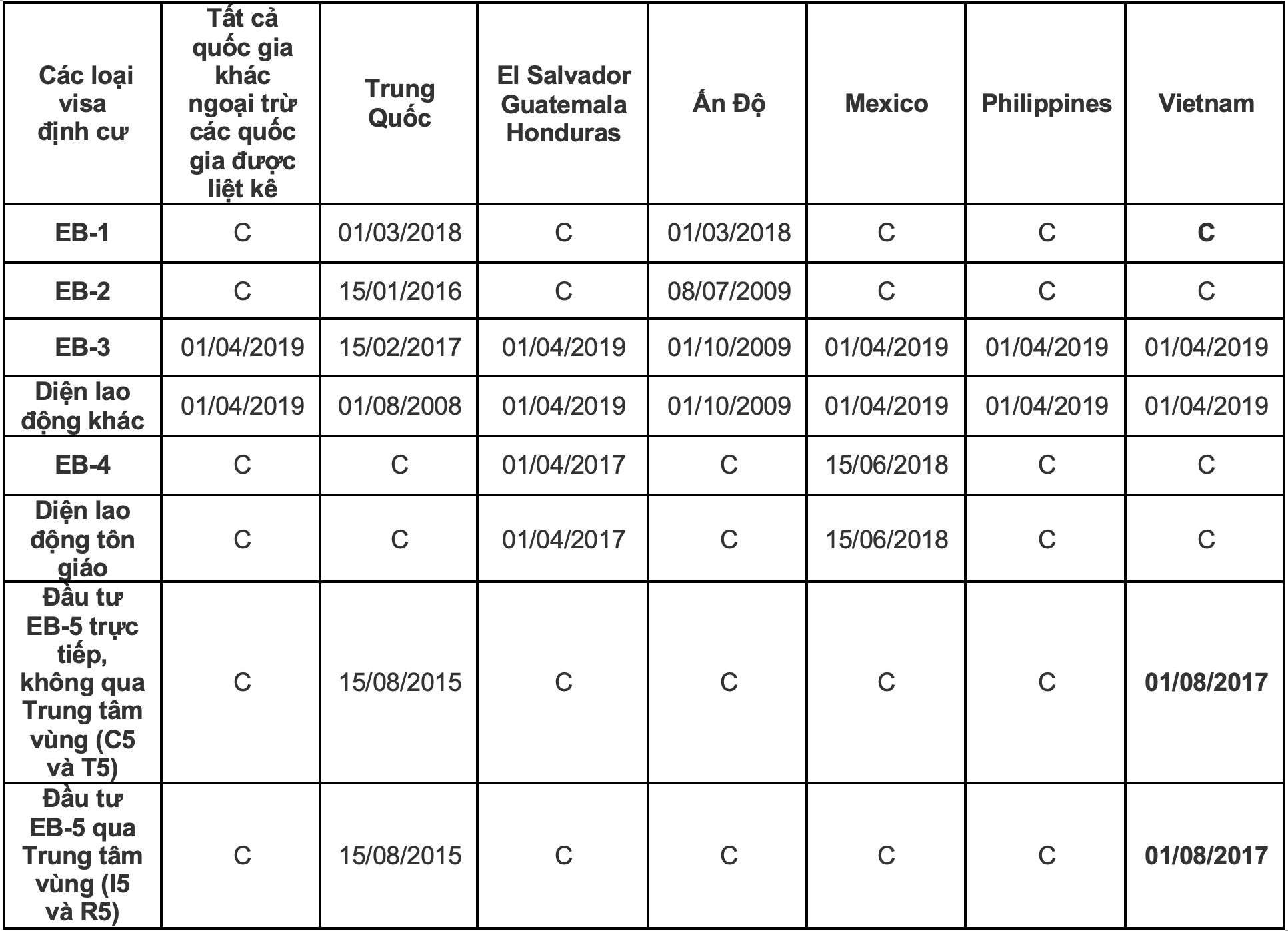Lưu ý: Lượng visa có sẵn chỉ dành cho những hồ sơ mà có “ngày ưu tiên” sớm hơn ngày hạn mức theo danh sách dưới đây: