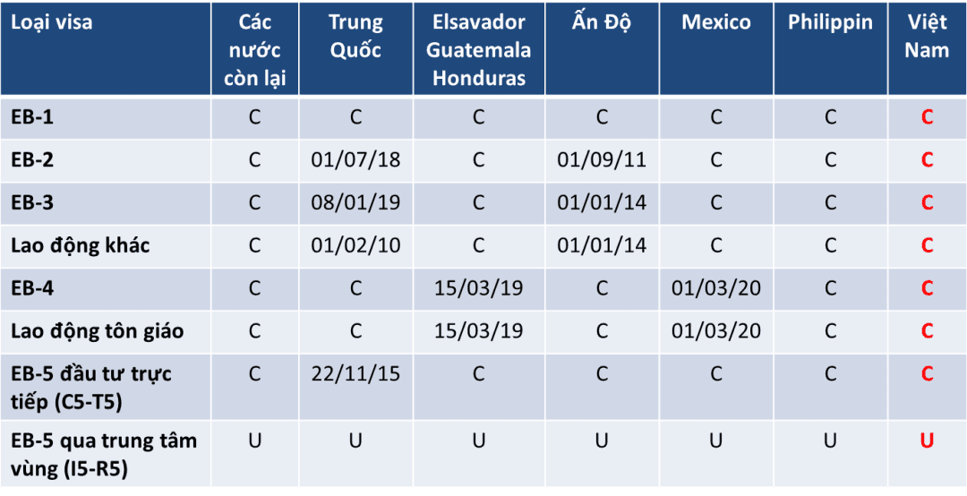 Lưu ý: Lượng visa có sẵn chỉ dành cho những hồ sơ mà có “ngày ưu tiên” sớm hơn ngày hạn mức theo danh sách dưới đây: