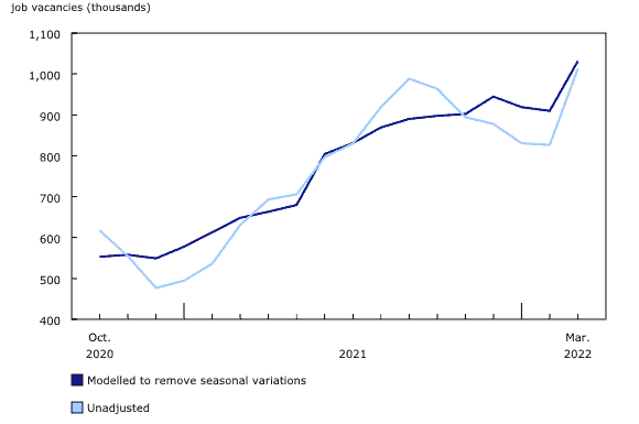 Một báo cáo của cơ quan Thống kê Canada cho thấy số lượng vị trí đang cần tuyển dụng đạt mức cao nhất mọi thời đại ở Canada – 1.012.900 vị trí trống vào đầu tháng 3 năm 2022, nhiều hơn mức kỷ lục trước đó là 988.300 vào tháng 9 năm 2021, tăng thêm 186.400 vị trí so với tháng 2. Tỷ lệ việc làm còn thiếu, đo lường số lượng vị trí trống theo tỷ lệ vị trí trống và được lấp đầy, phù hợp với mức cao kỷ lục 5,9% cũng được quan sát vào tháng 9 năm ngoái (không điều chỉnh theo mùa).