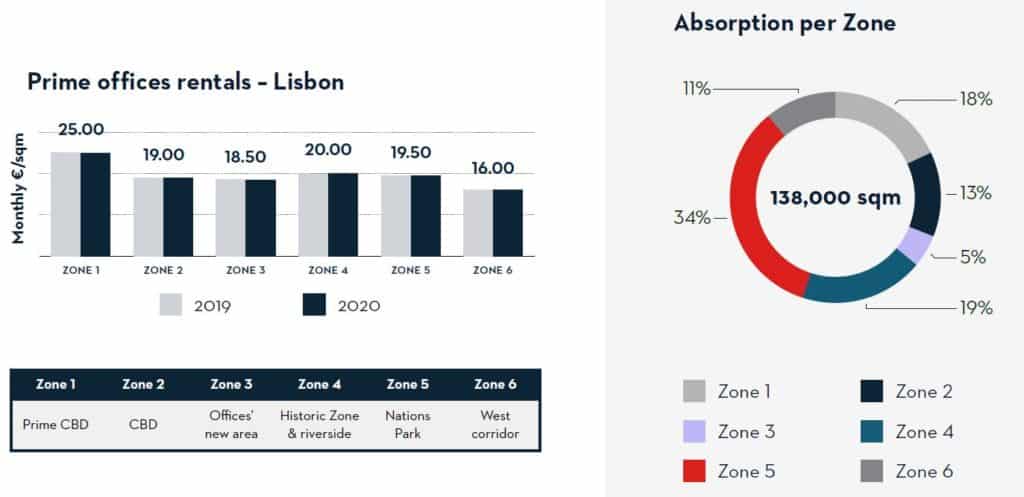 Giá thuê trung bình và tỷ trọng văn phòng cho thuê của 6 khu vực tại Lisbon năm 2020